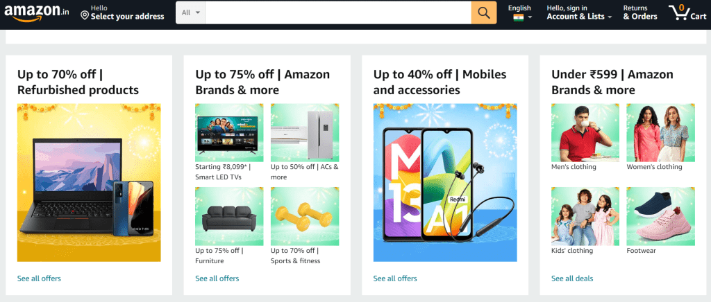The discounts on Amazon Great Indian Festival vary according to category. Amazon offers up to 40% off on mobiles and accessories, up to 70% off on home and kitchen products, 75% on electronics, and 80% on fashion.